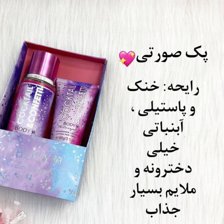 حجم لوسیون ۸۸ گرم هست و بسیار پوست رو نرم و لطیف میکنه. اصلا حساسیت زا هم نیست. بادی اسپلش ۱۵۰ میل هست. بادی اسپلش شاین هست